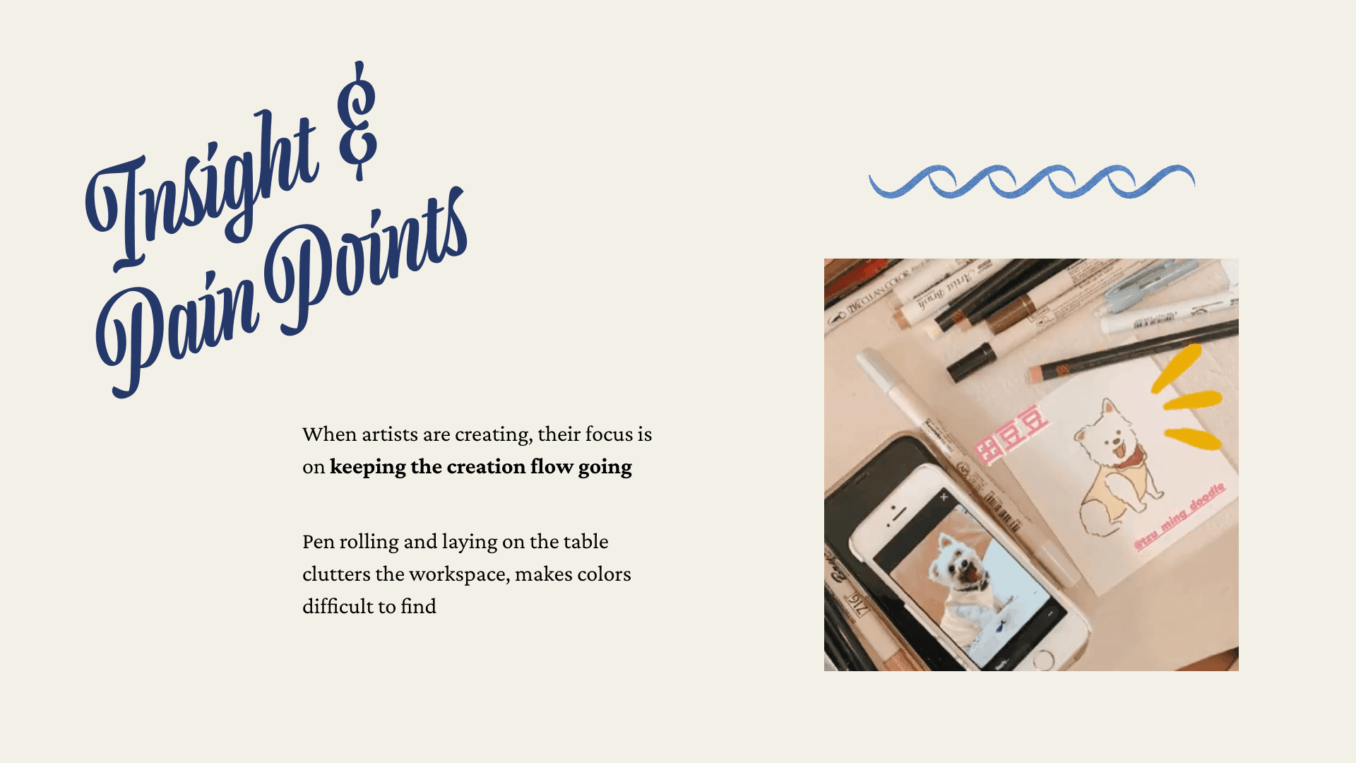 The current packaging of the markers is a flat, rectangular plastic box that has a narrow opening on the top. This compact packaging is a great storage for the markers, to keep them neatly packed when not in use. However, when artists are creating, this packaging, along with markers that was taken out of the packaging, becomes clutter on their workspace. This results in an unorganized workflow where artist had to locate the next color in a pile of markers, further disrupting the creation process.