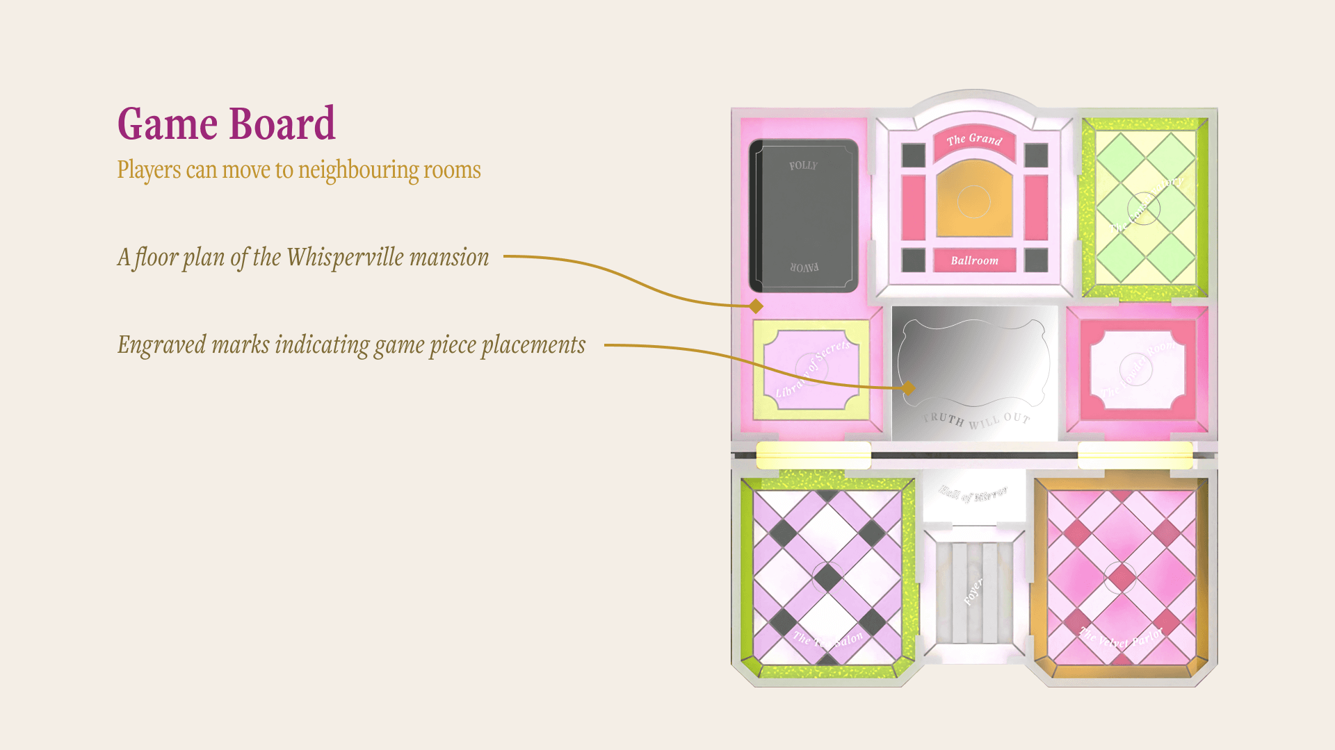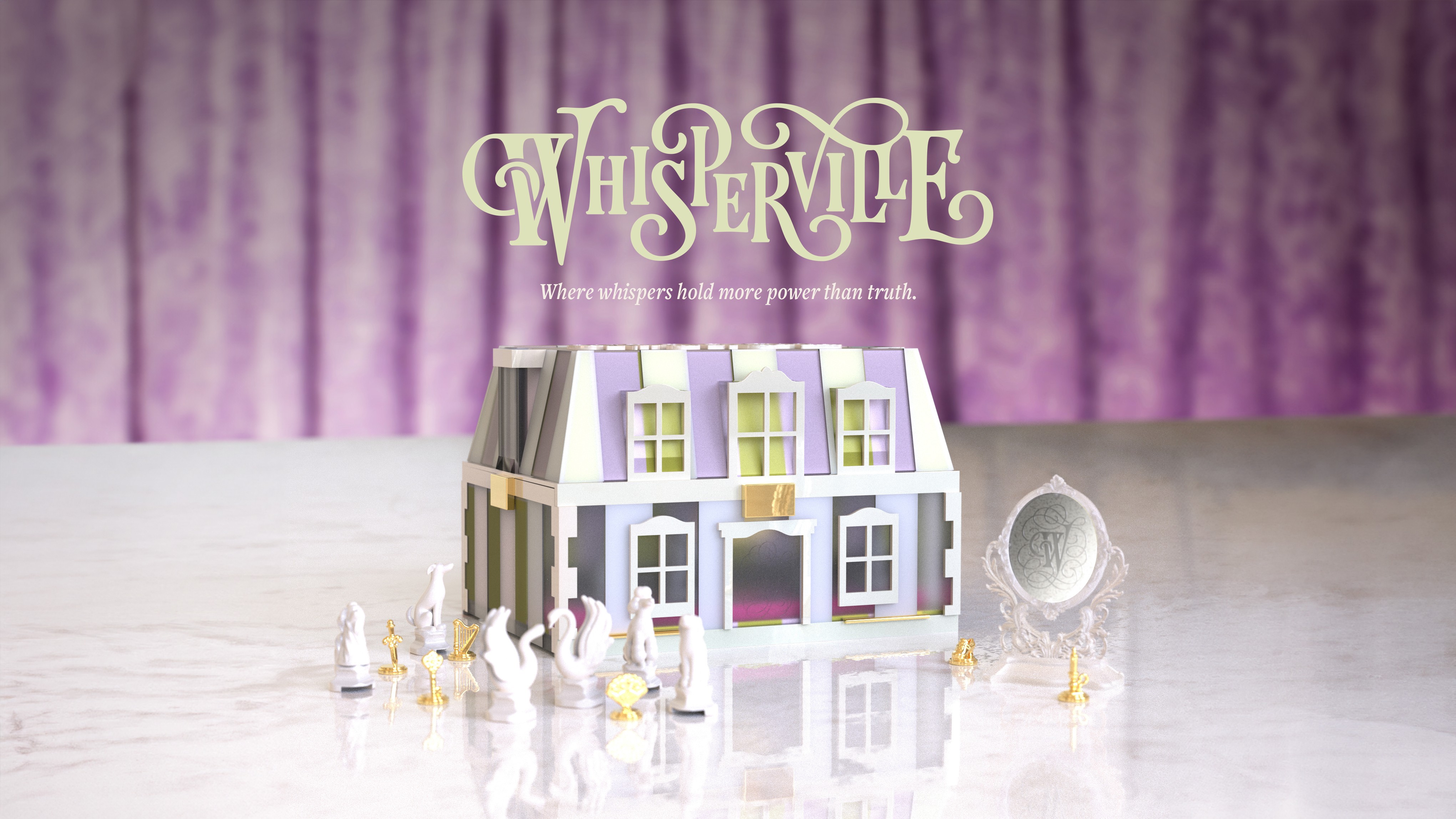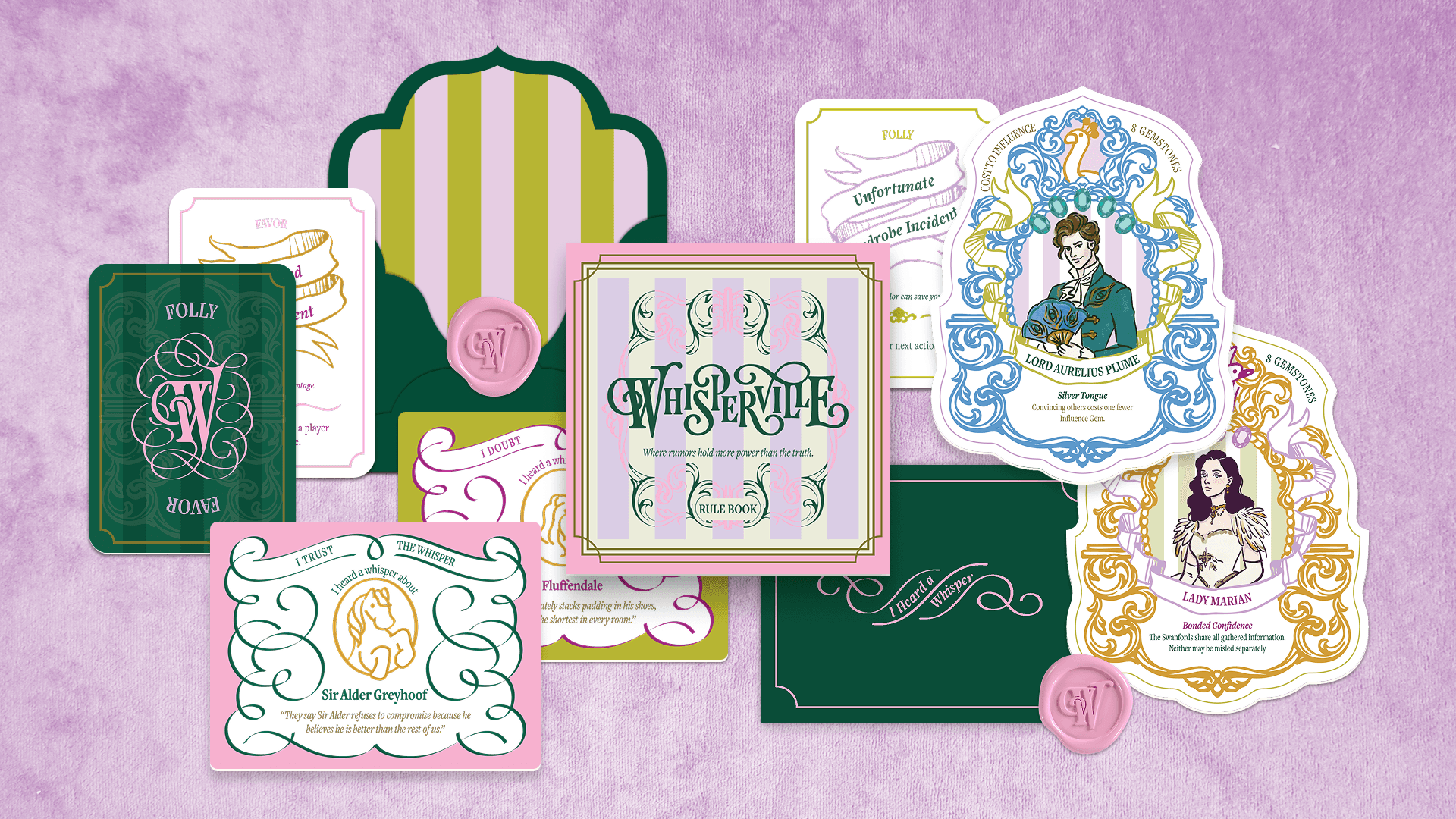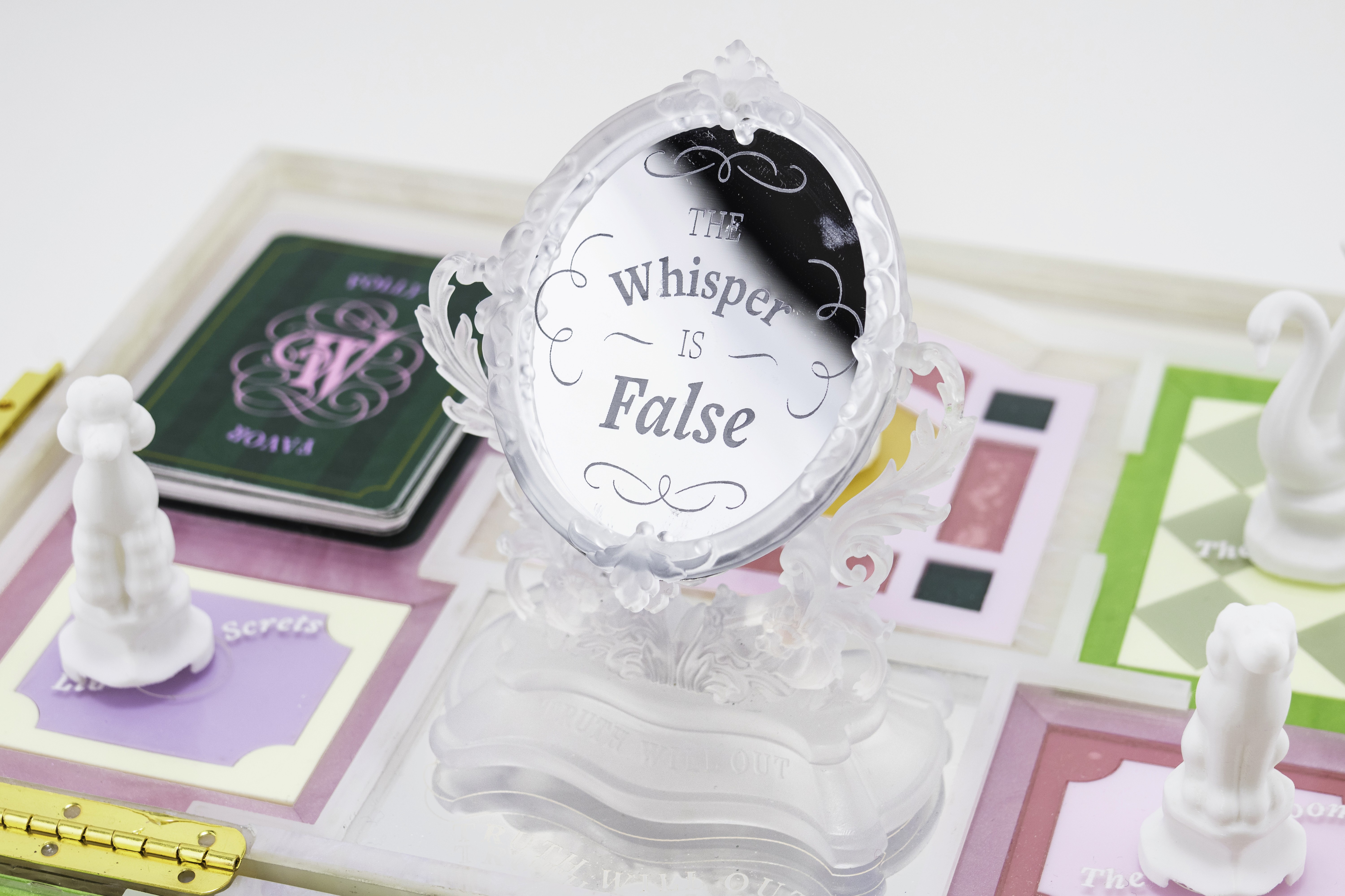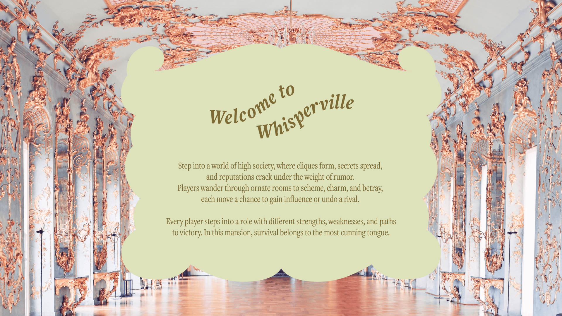 Whisperville is an artisanal luxury strategic board game about gossip and social maneuvering, set in a 18th century baroque grand mansion.