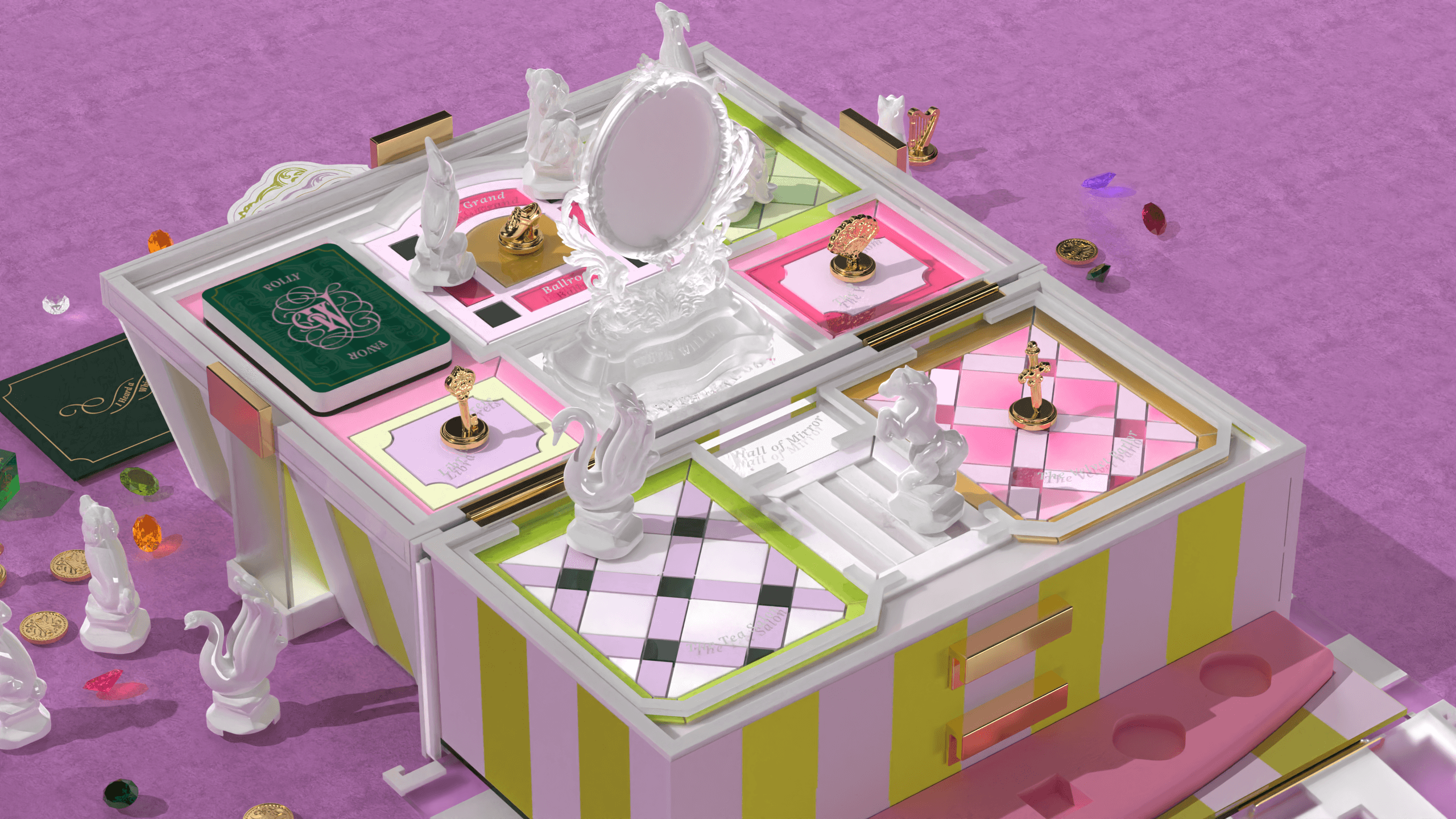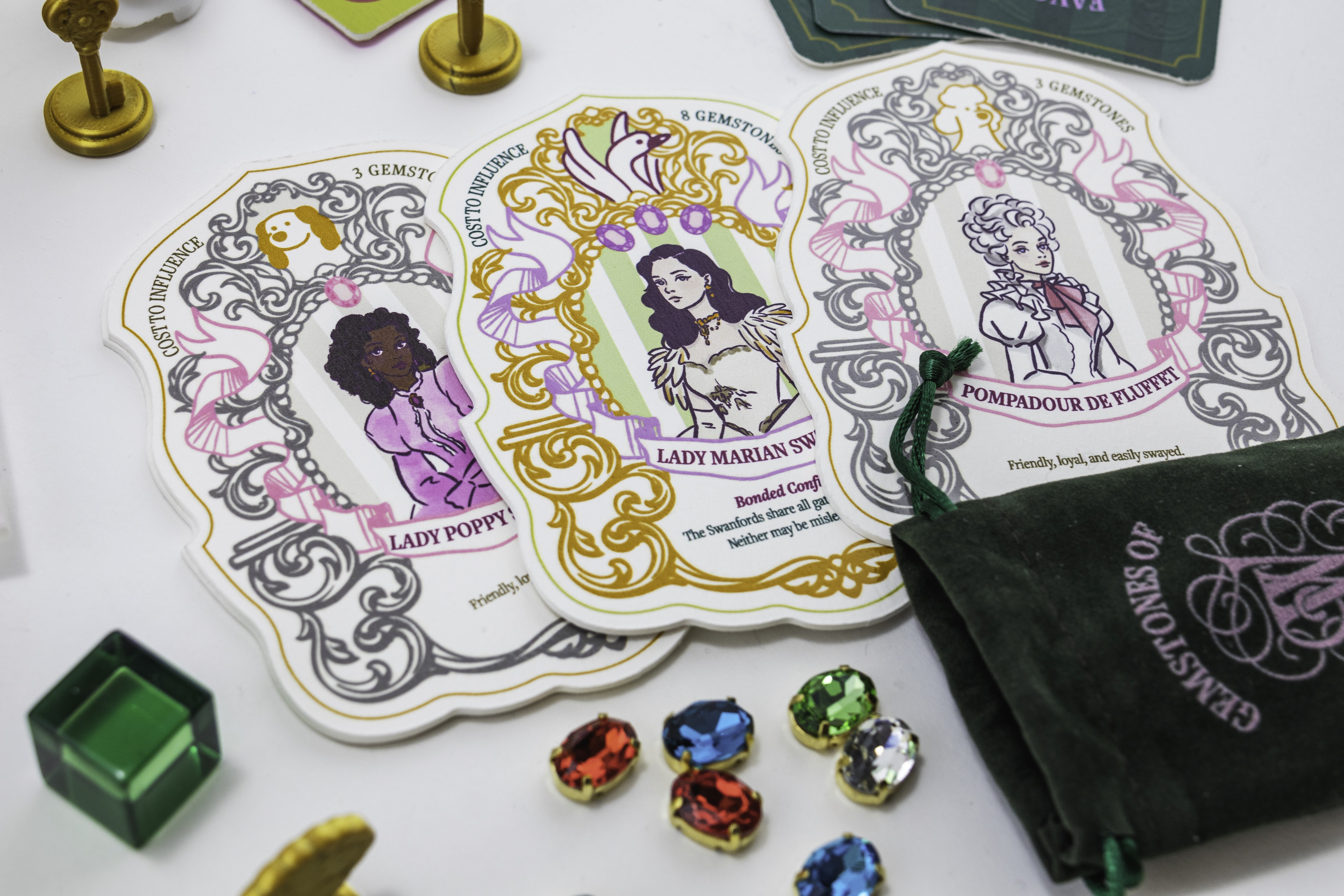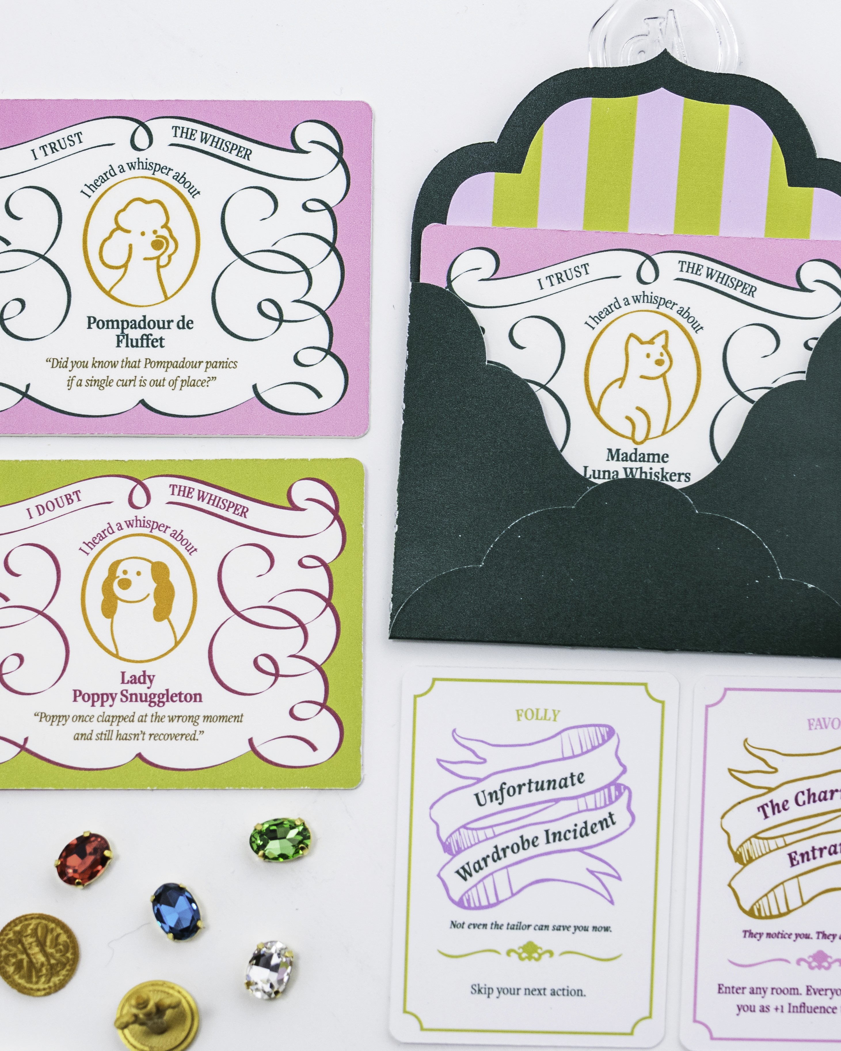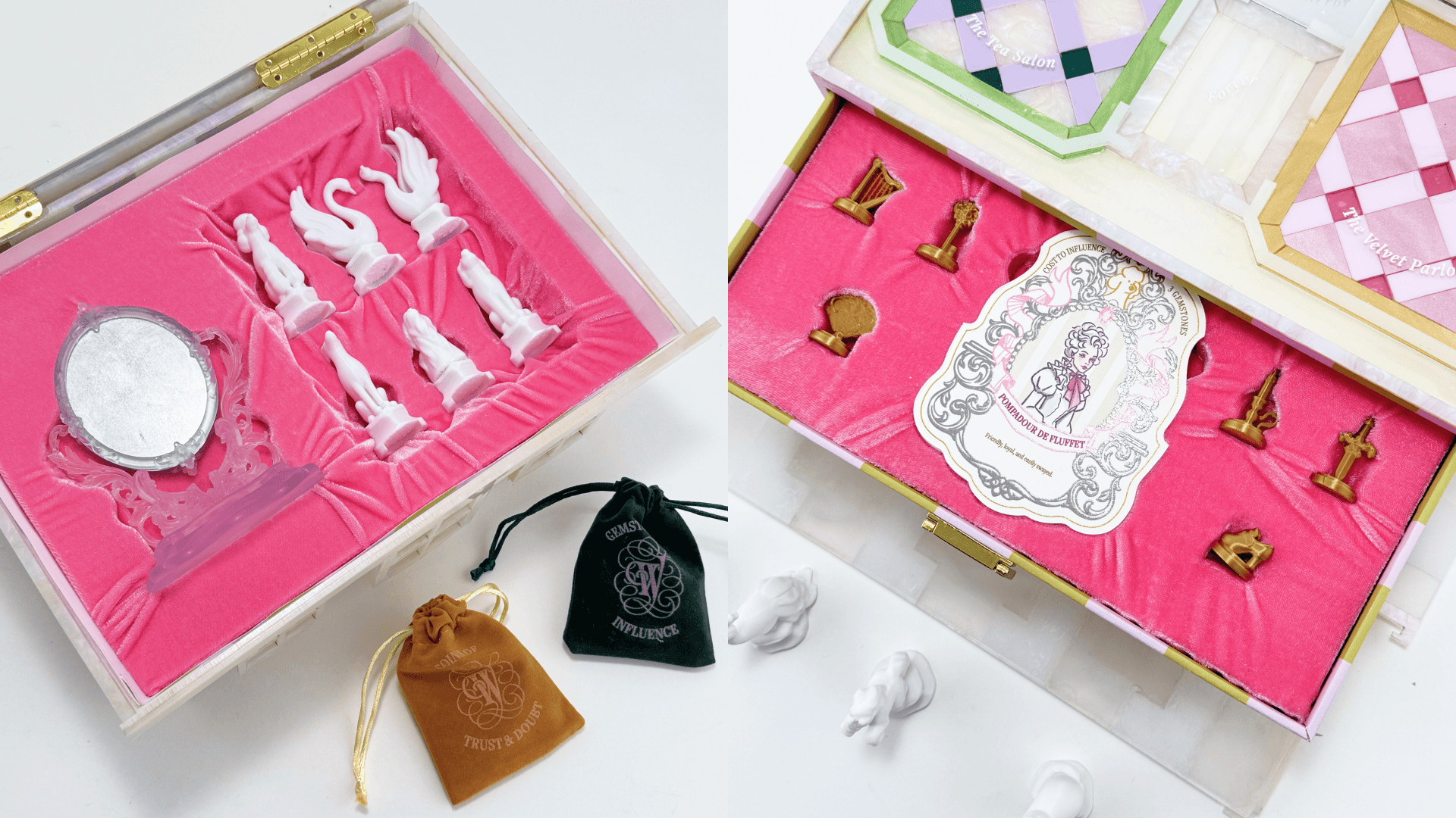 Whisperville is an artisanal luxury strategic board game about gossip and social maneuvering, set in a 18th century baroque grand mansion.
