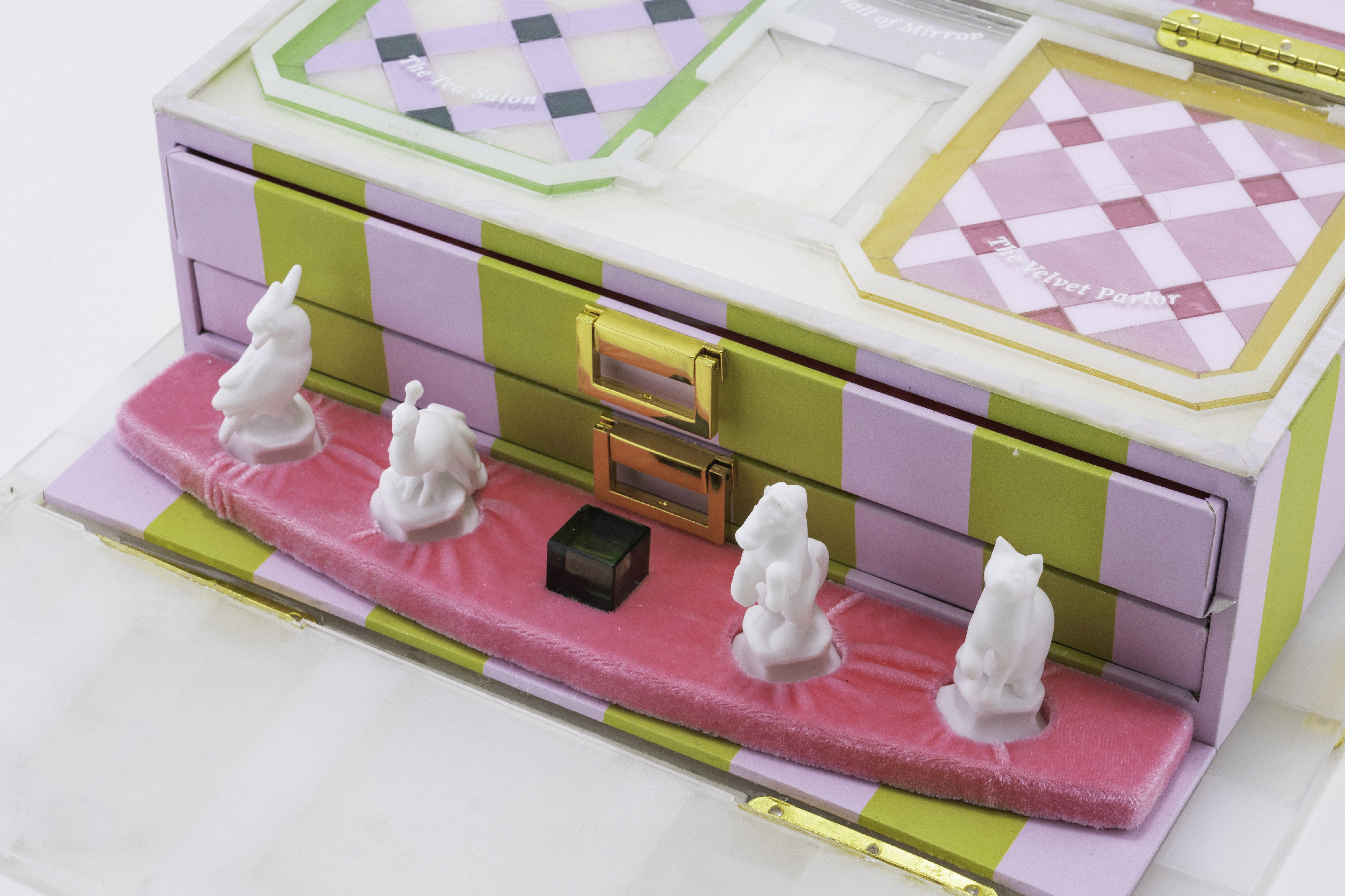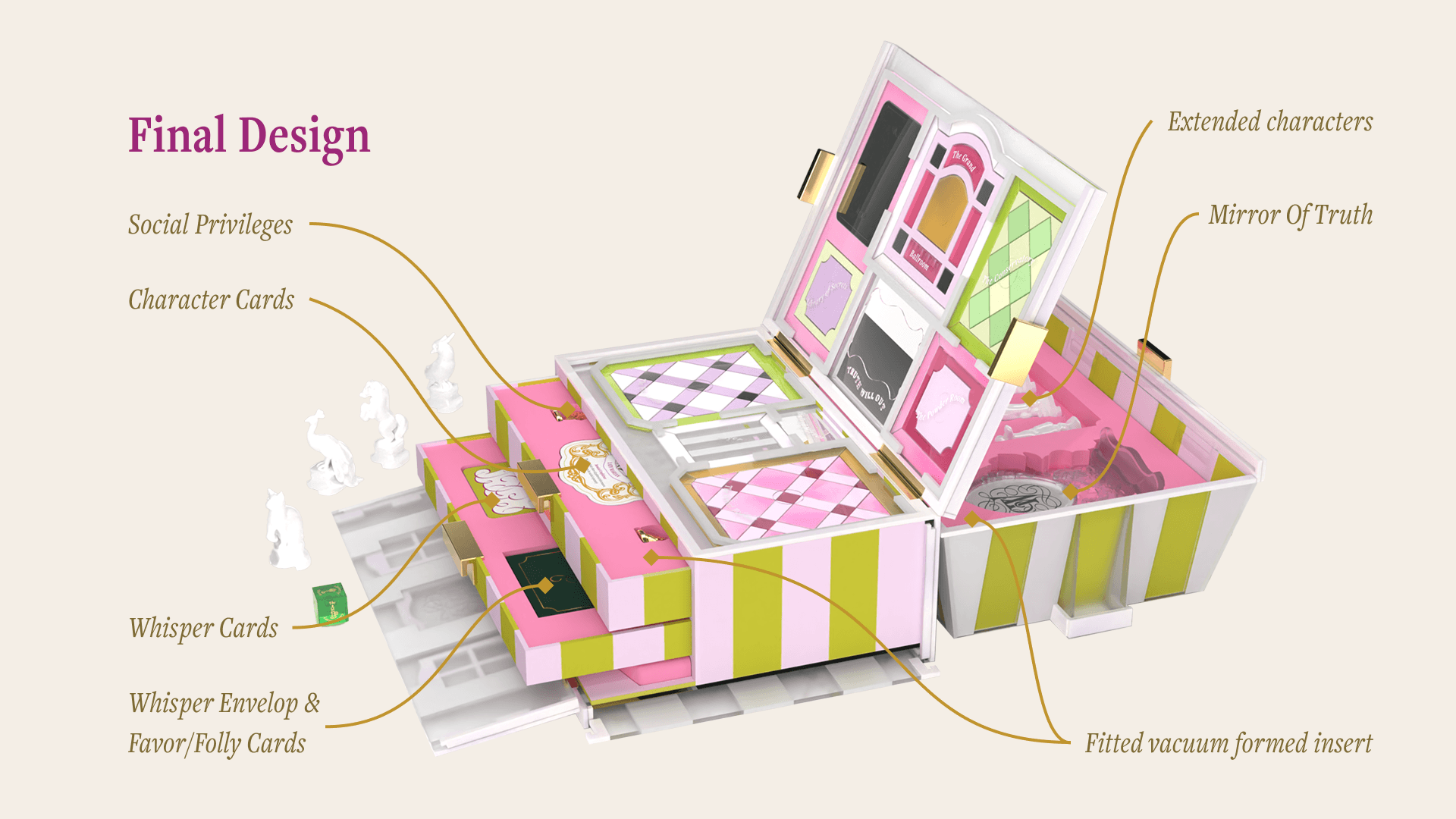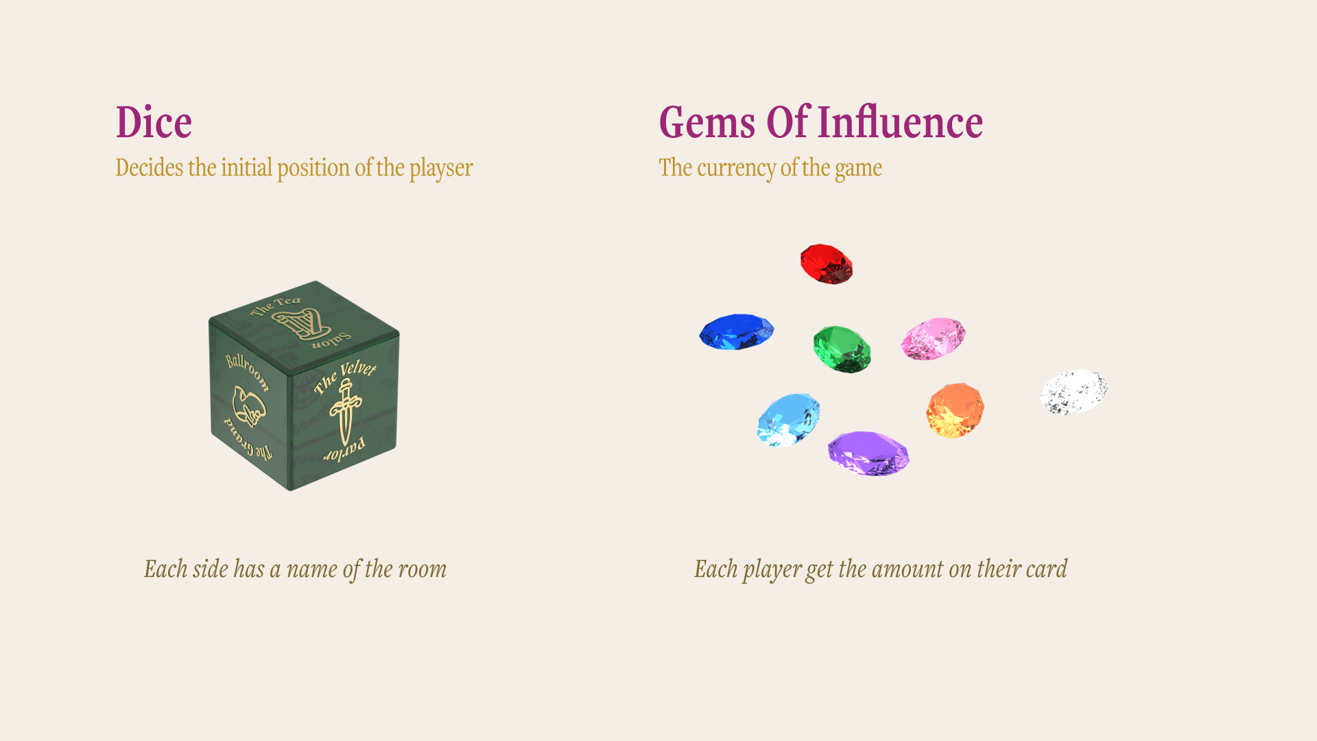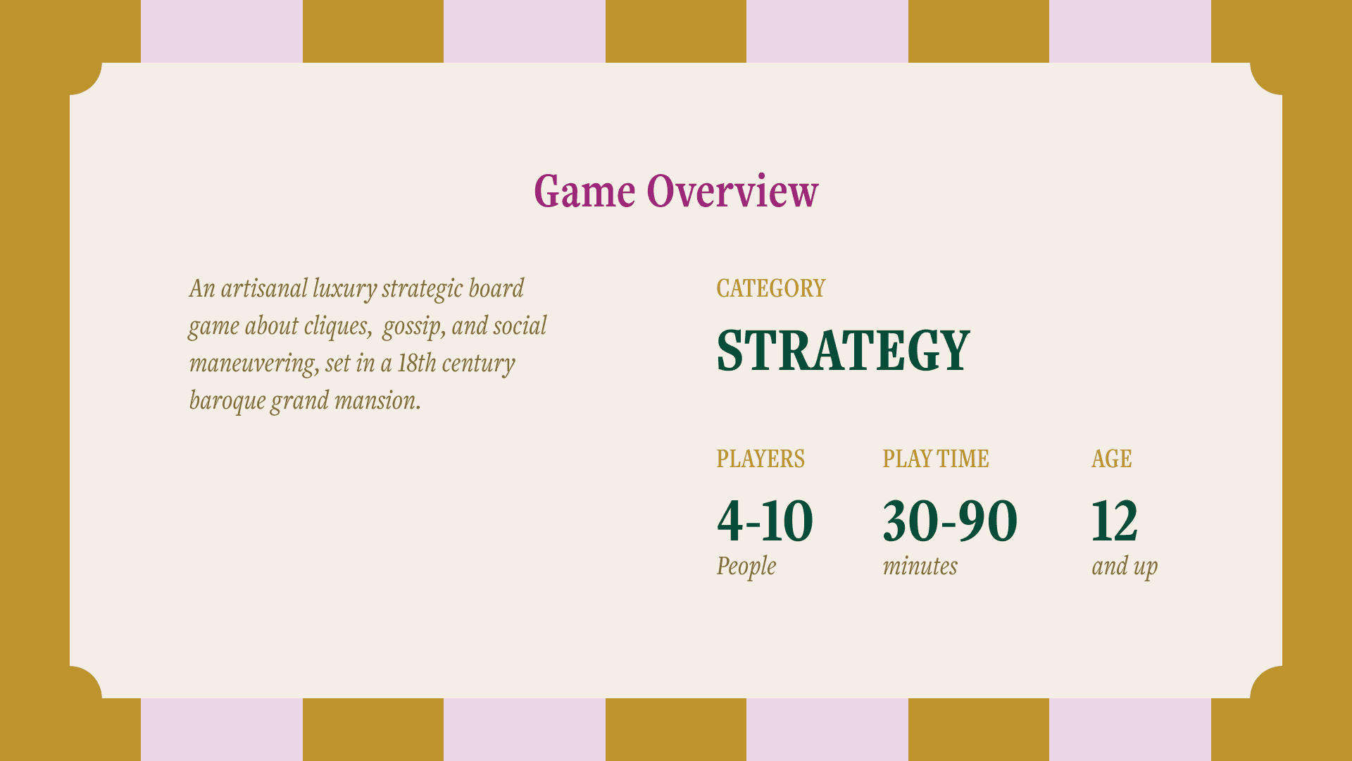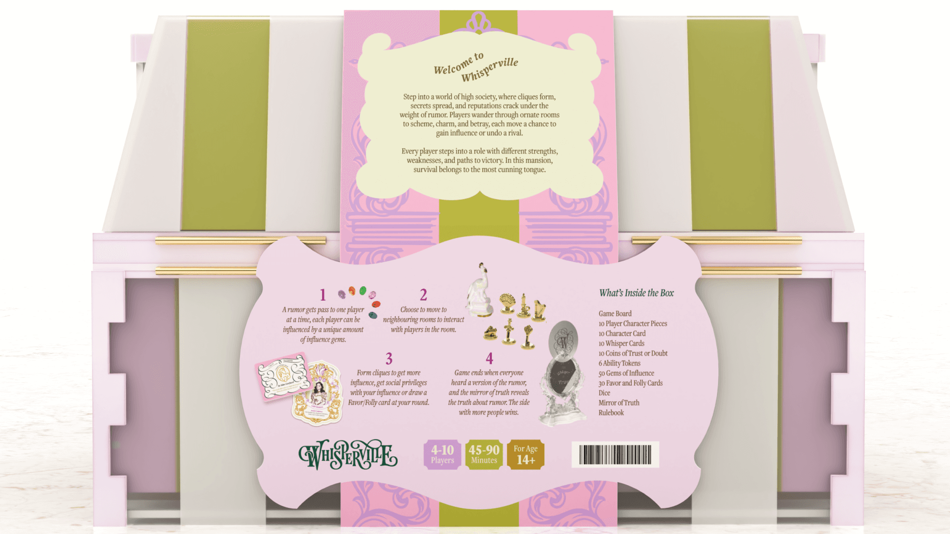Whisperville is an artisanal luxury strategic board game about gossip and social maneuvering, set in a 18th century baroque grand mansion.