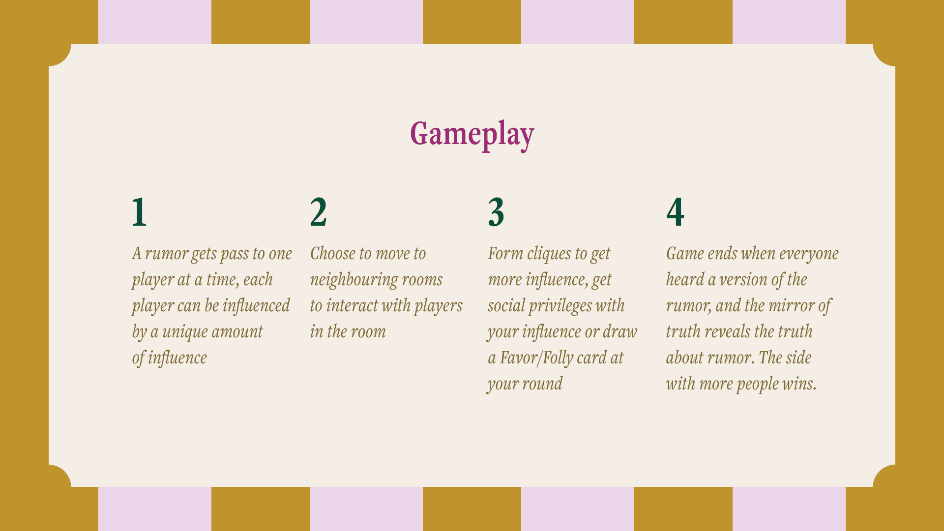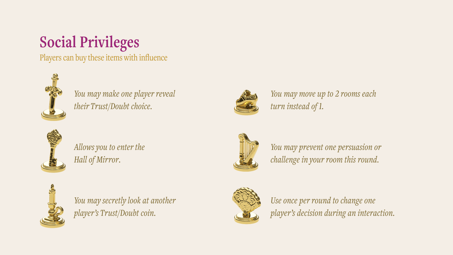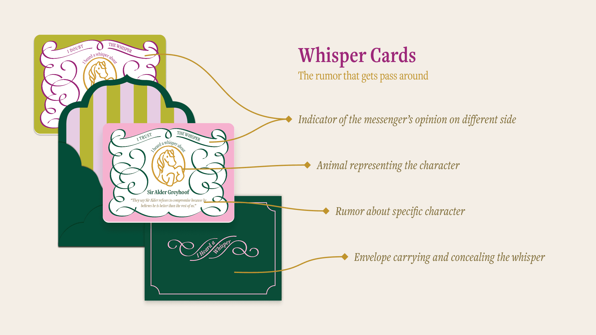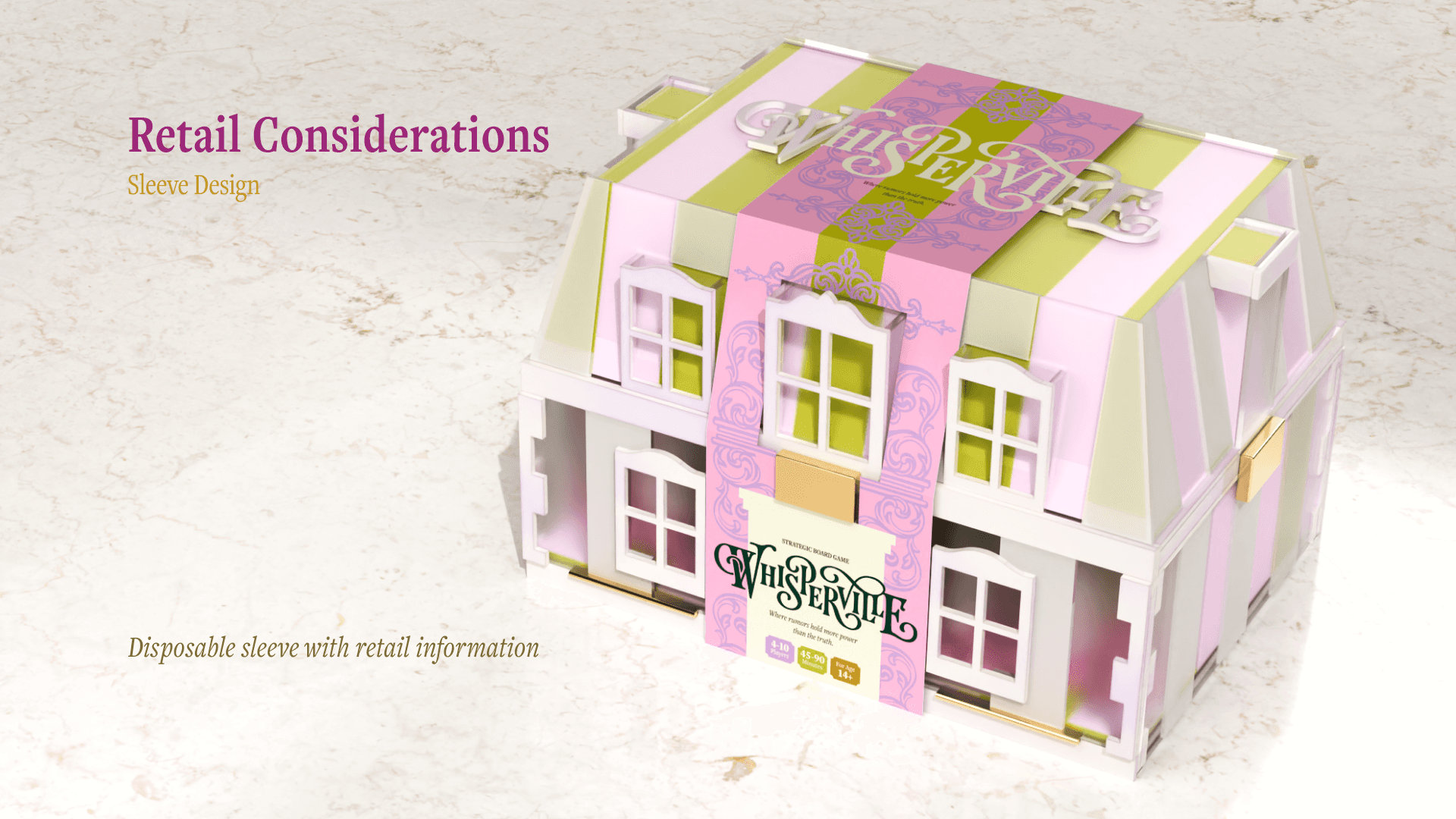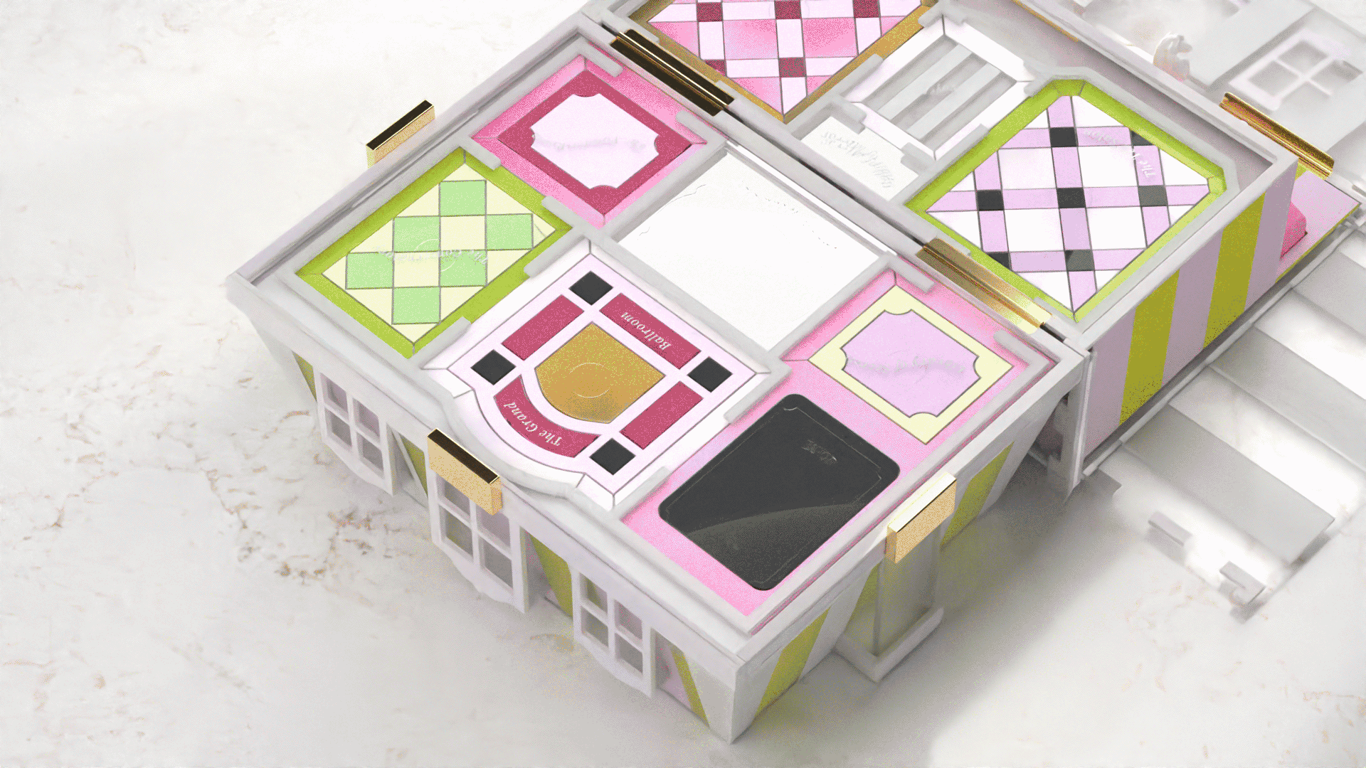 Whisperville is an artisanal luxury strategic board game about gossip and social maneuvering, set in a 18th century baroque grand mansion.
